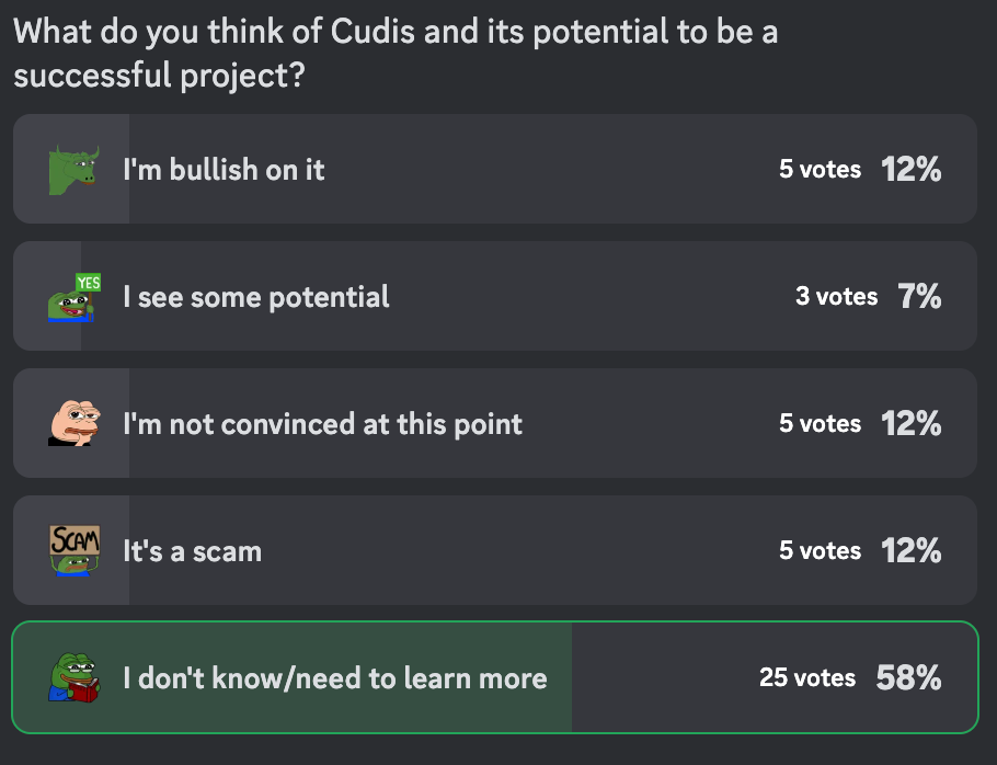 Our Discord community is full of passionate DePIN miners who all have thoughts about Cudis. We asked their opinion. Here is a snapshot of our recent poll.
