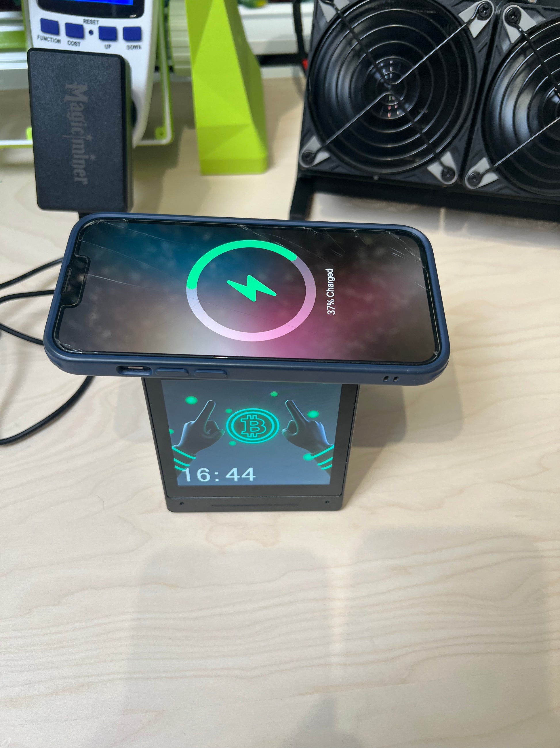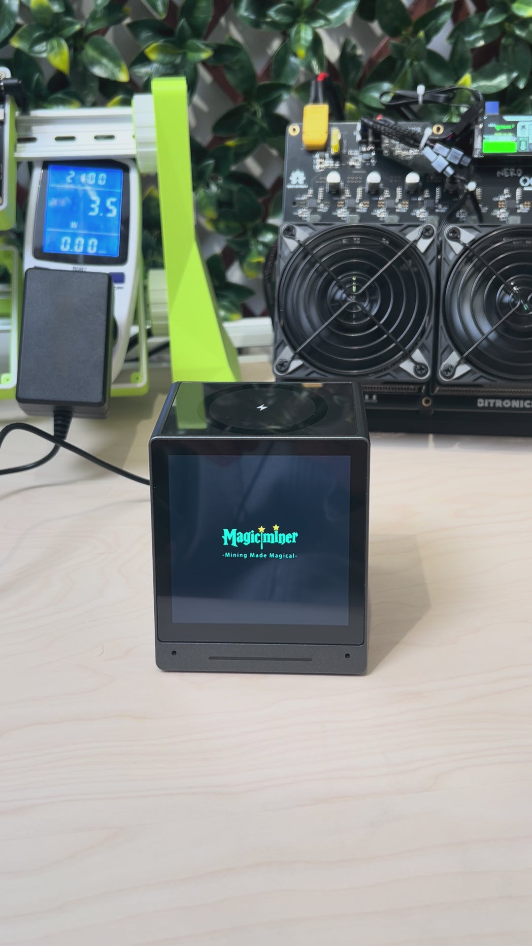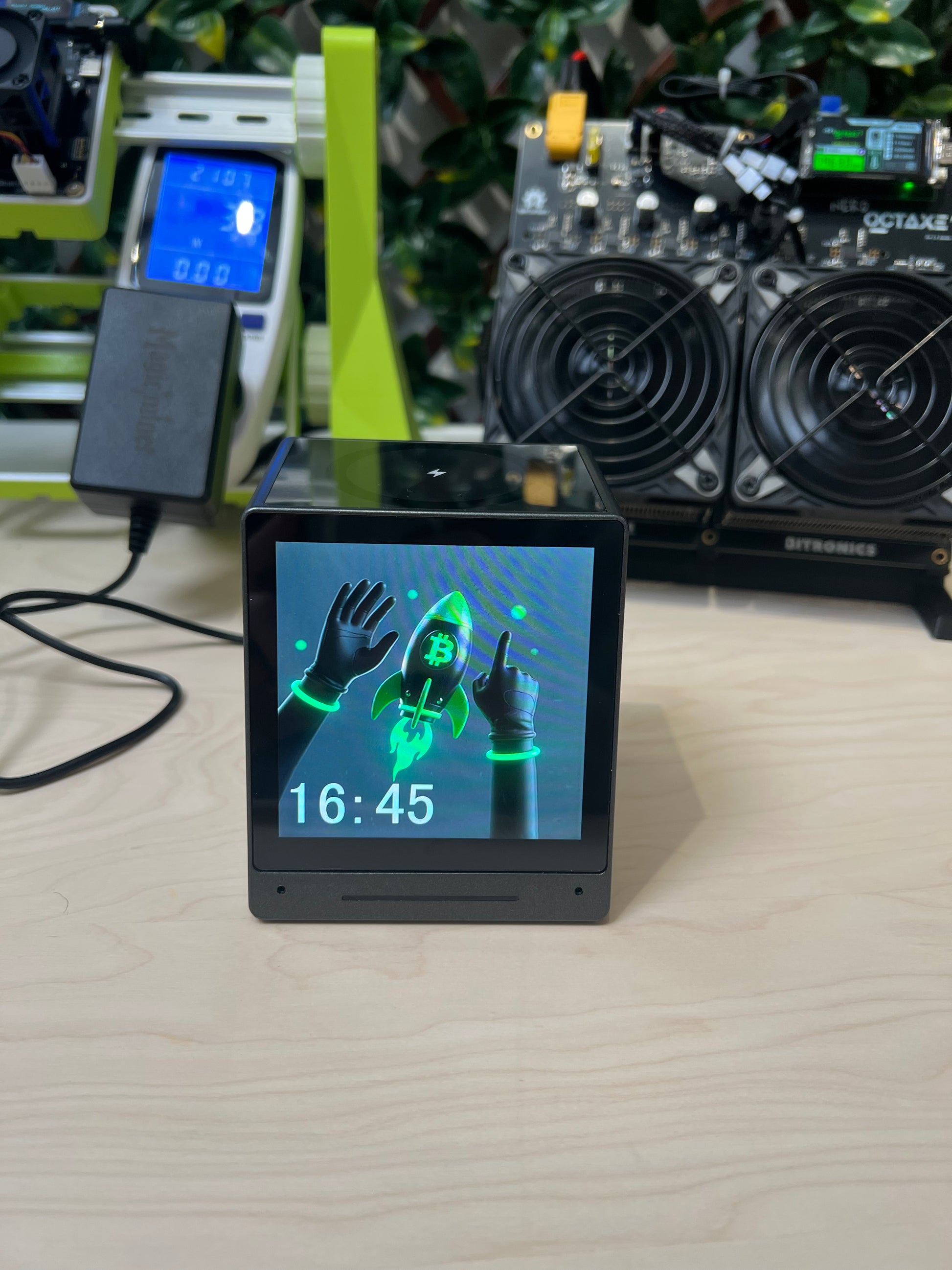 The Magicminer MO01 is an all-in-one smart desktop terminal that combines real-time market data, a built-in Bluetooth speaker, a three-in-one wireless charger, alarm clock functionality, and customizable displays in a compact design. It also mines Bitcoin at 1000 KH/s.
